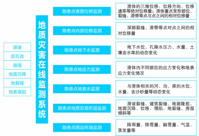 | 依据《崩塌、滑坡、泥石流监测规范》(DZ/T0221-2006)的规定, 各自要求的监测内容归纳如下: 滑坡、崩塌具体监测参数如下: 滑坡地表裂缝、崩塌裂缝的变形监测、滑坡、崩塌体深部位移监测、崩塌体倾斜变形监测、降雨量监测、气温监测、土体湿度监测、地下水位监测、孔隙水压力监测、土压力监测、地声监测、视频监测 泥石流其常用的实用化监测参数如下: 降雨量监测、孔隙水压力监测、土压力计监测、泥石流位移监测、地声监测、次声监测、视频监测地面沉降主要监测参数如下: 降雨量监测、地下水位监测、地表裂缝监测、地面沉降量监测 |
