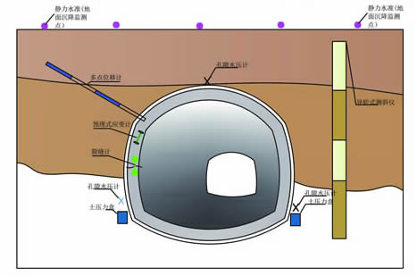 | 围岩及支护状态的观察描述、地表沉降、隧道拱顶沉降、隧道收敛监测、附近的建筑物倾斜监测、孔隙水压力监测、支护土压力监测、土体垂直位移监测、土体水平位移监测 | ||||||||||||||||||||||||||