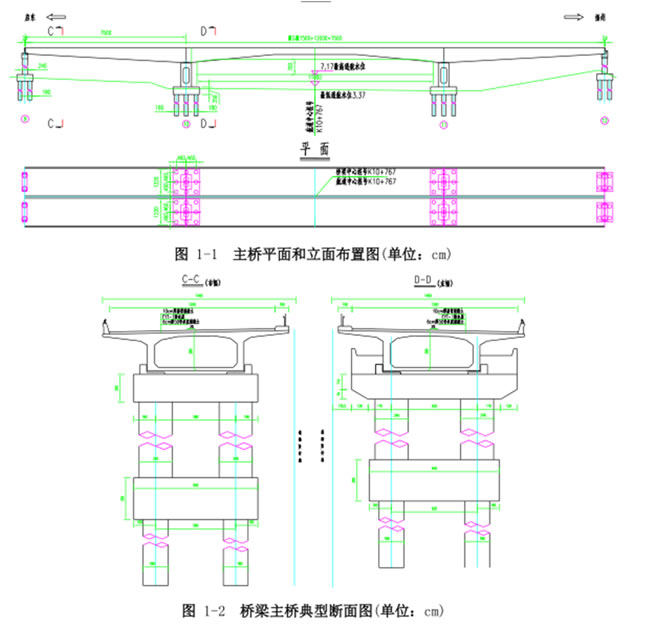 京杭运河特大桥位于扬州市启扬高速公路,桩号 K237+508,桥长 1118.2m,跨径组成为(9×50)m 逐孔浇注等截面预应力砼连续箱梁+(75+120+75)m 变截面预应力砼连续箱梁+(13×30)m 装配式部分预应力砼连续箱梁,主桥中墩采用空心薄壁墩,其它墩采用柱式墩,基础采用钻孔灌注桩。桥梁通车时间为 2003 年 10 月,设计荷载为汽车-超 20 级,挂-120;桥梁分幅设置,桥面布置为 0.5m(外护栏)+12m(行车道)+1m(内护栏)+1m(中央分隔带)+1m(内护栏)+12m(行车道)+0.5m(外护栏);桥梁全宽 28.0m。主桥平面、立面及断面布置如图 1-1、图 1-2 所示。
