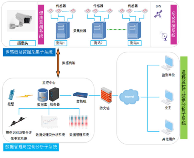 整个监测系统包括硬件和软件两个部分,其中硬件部分包括:(1)传感器系统;(2)数据采集系统;(3)数据采集与传输系统;(4)数据收集及存储系统。软件系统包括监控中心上的健康监测服务端系统、远程计算机上基于数据深度处理的结构状态识别系统等。总体框图见图1-1,桥梁现场主要由传感器和采集模块获得响应的实时数据,然后经过光纤传输至桥址附近的监控中心,用户通过监控中心内的服务器获取采集系统的监测数据。数据中心获取数据之后经过预处理通过网络远程传输至用户计算机。