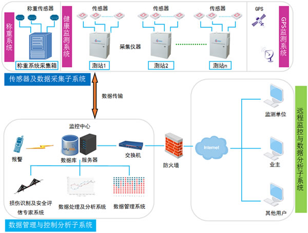 为了能建立一套稳定可靠、实时采集分析传输的健康监测系统,对雨棚的长期安全运营和养护提供强有力的技术支持,以及能通过远程网络及时了解雨棚的运行情况及各测点的特征值和预处理结果,并通过大量的特征值和实时采集数据的分析,我公司特地建立一套完整的评估和预警系统(如图1)。